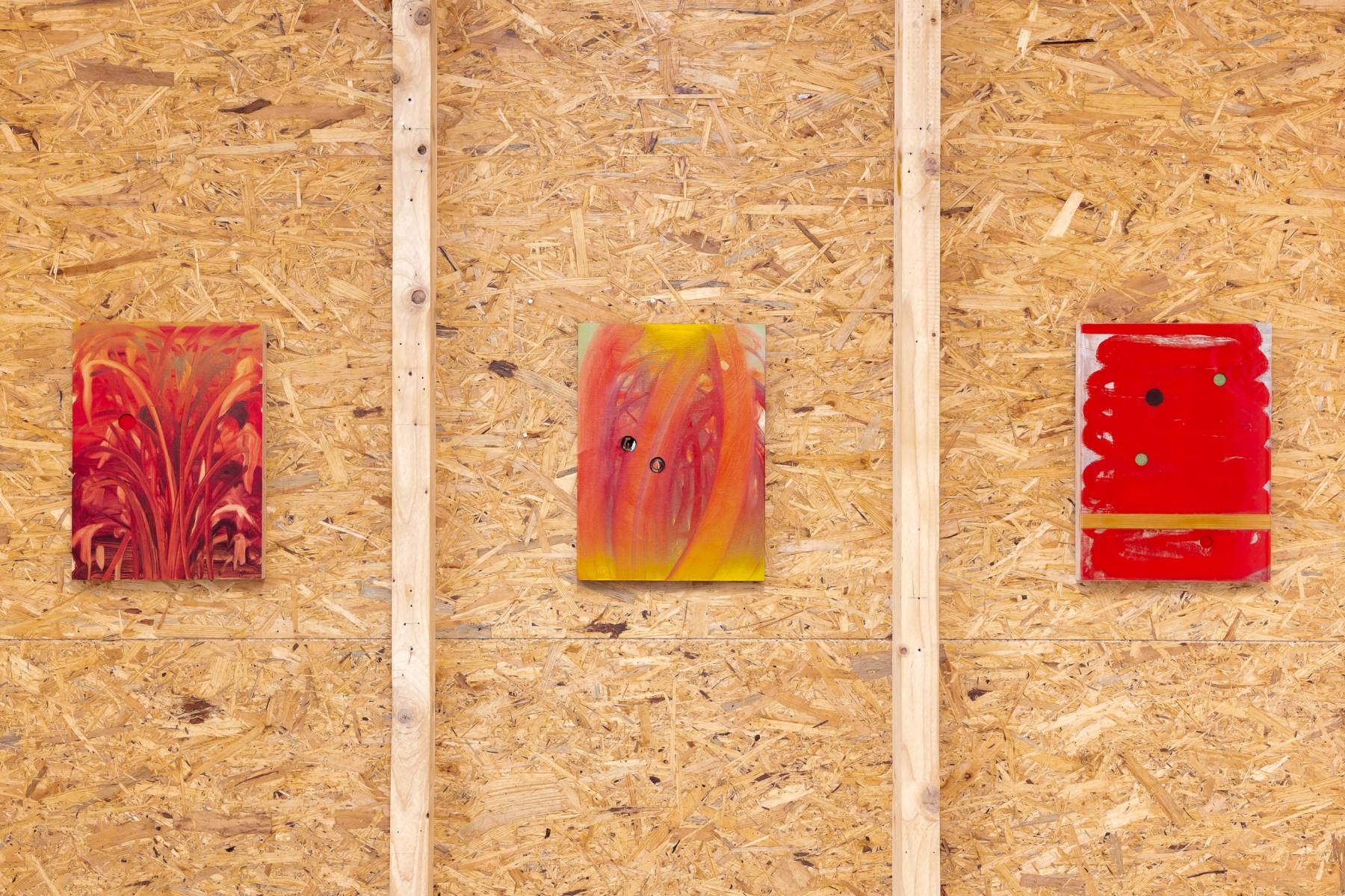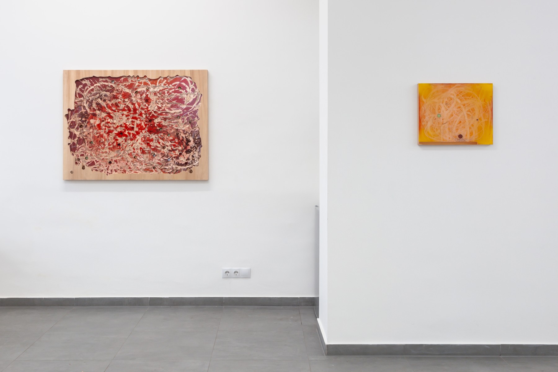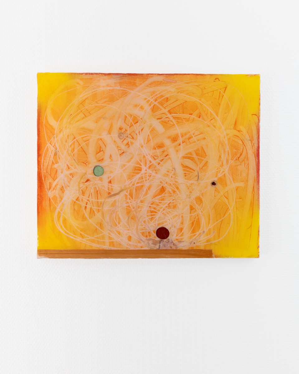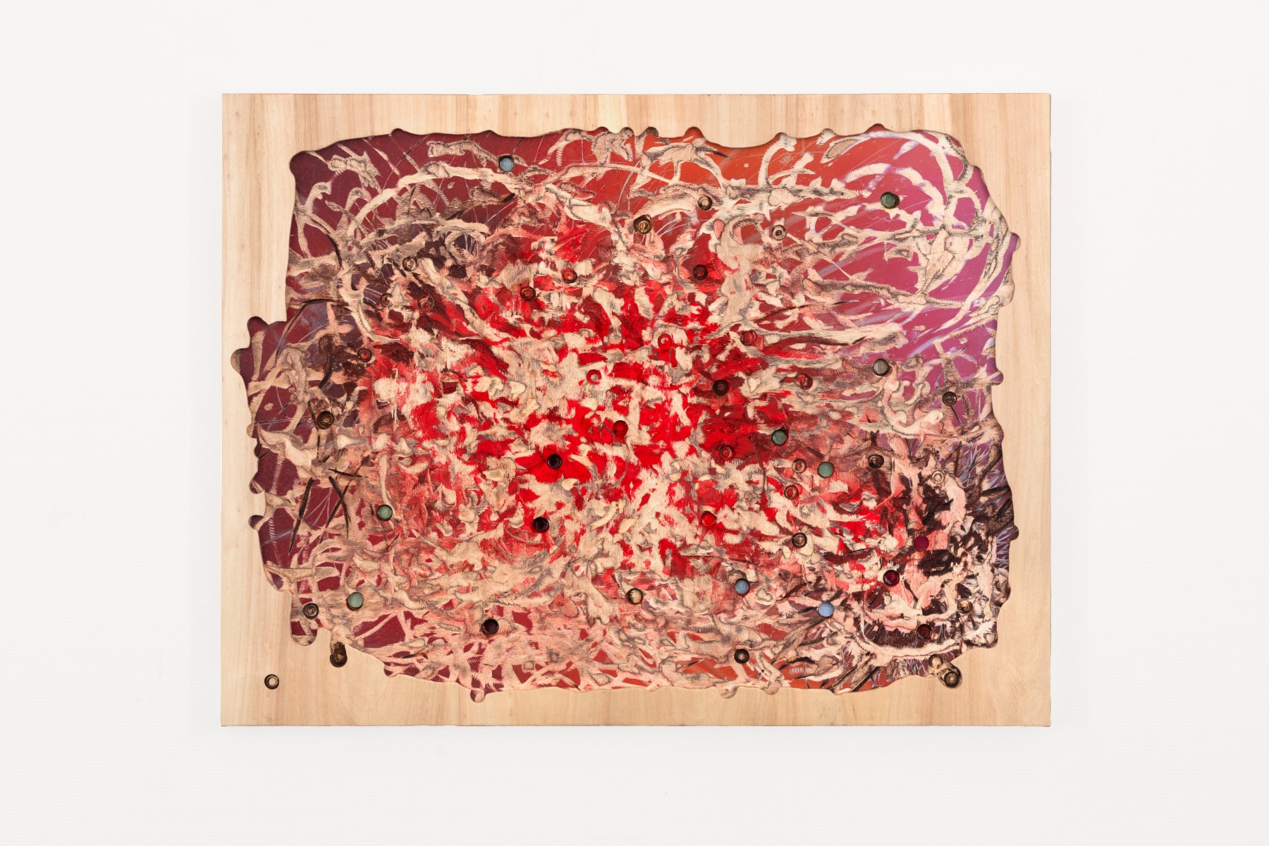 A geological dimension unfolds in stratified layers of wood, assembled and overlaid with oil, spray paint, or acrylic, then excavated through insistent, concentric gestures. Light rises from below, inscribed within a deep time, both consequence of action and enduring wound. Accidents and burns are integral to the painting. The raw clarity of wood is accessible only through the grey trails left by tools, through splinters and emergent screws. Nothing reveals itself without resistance.
