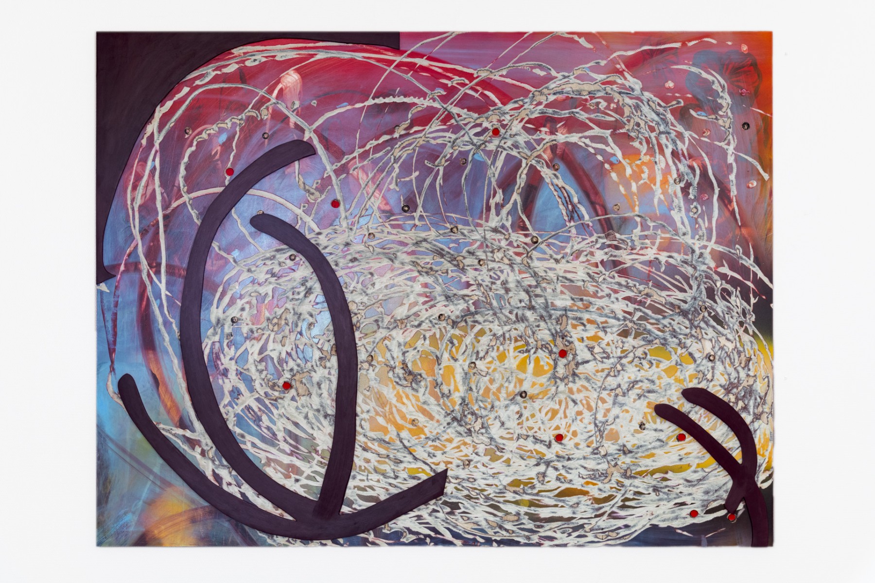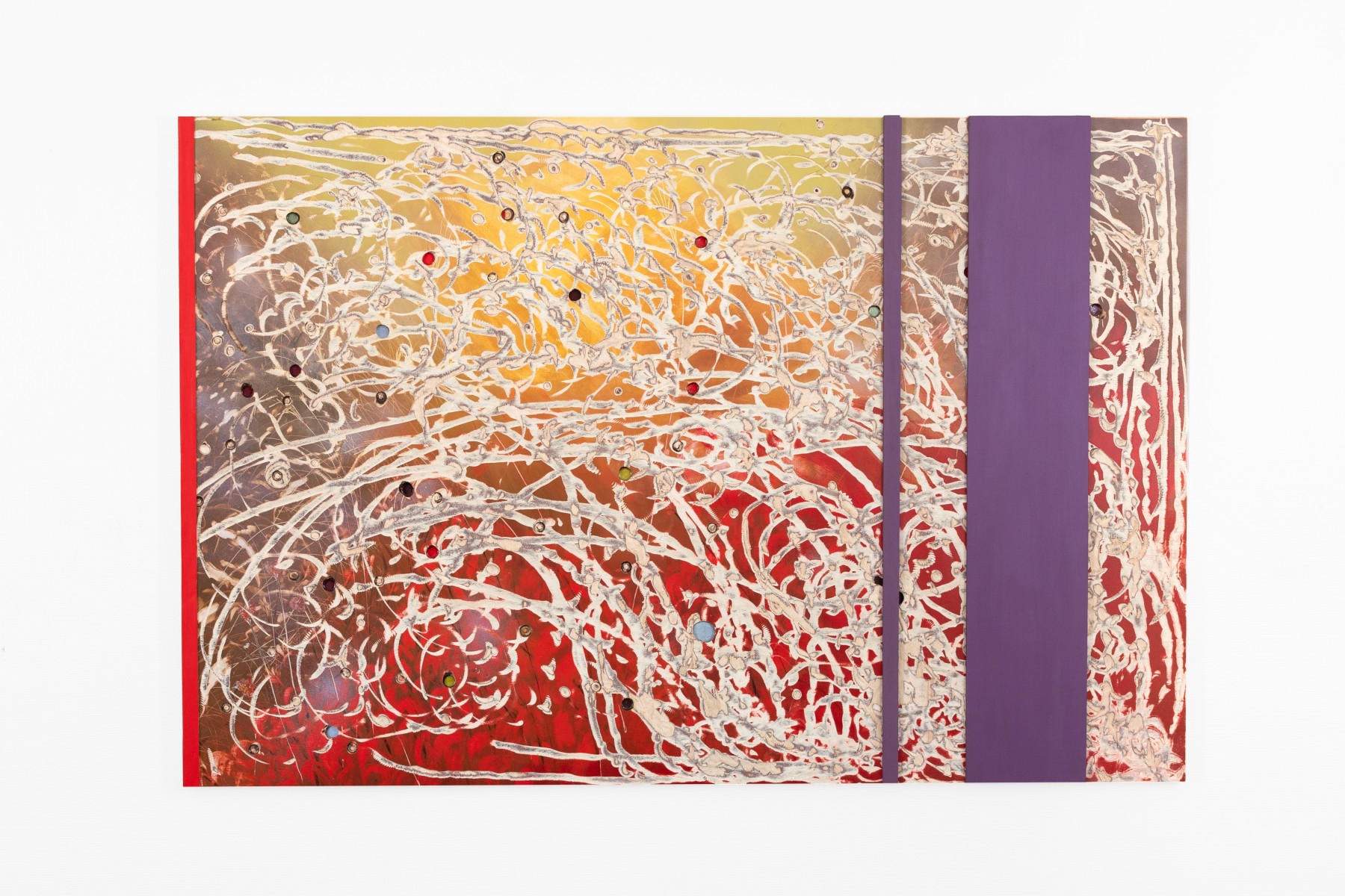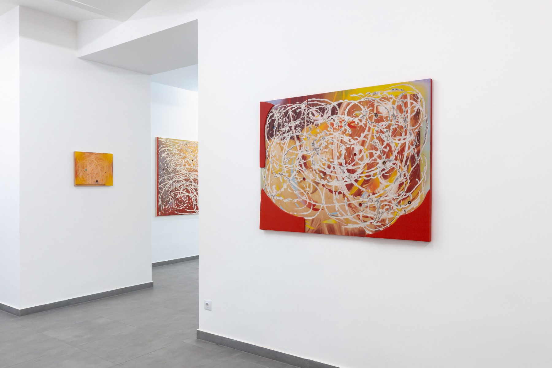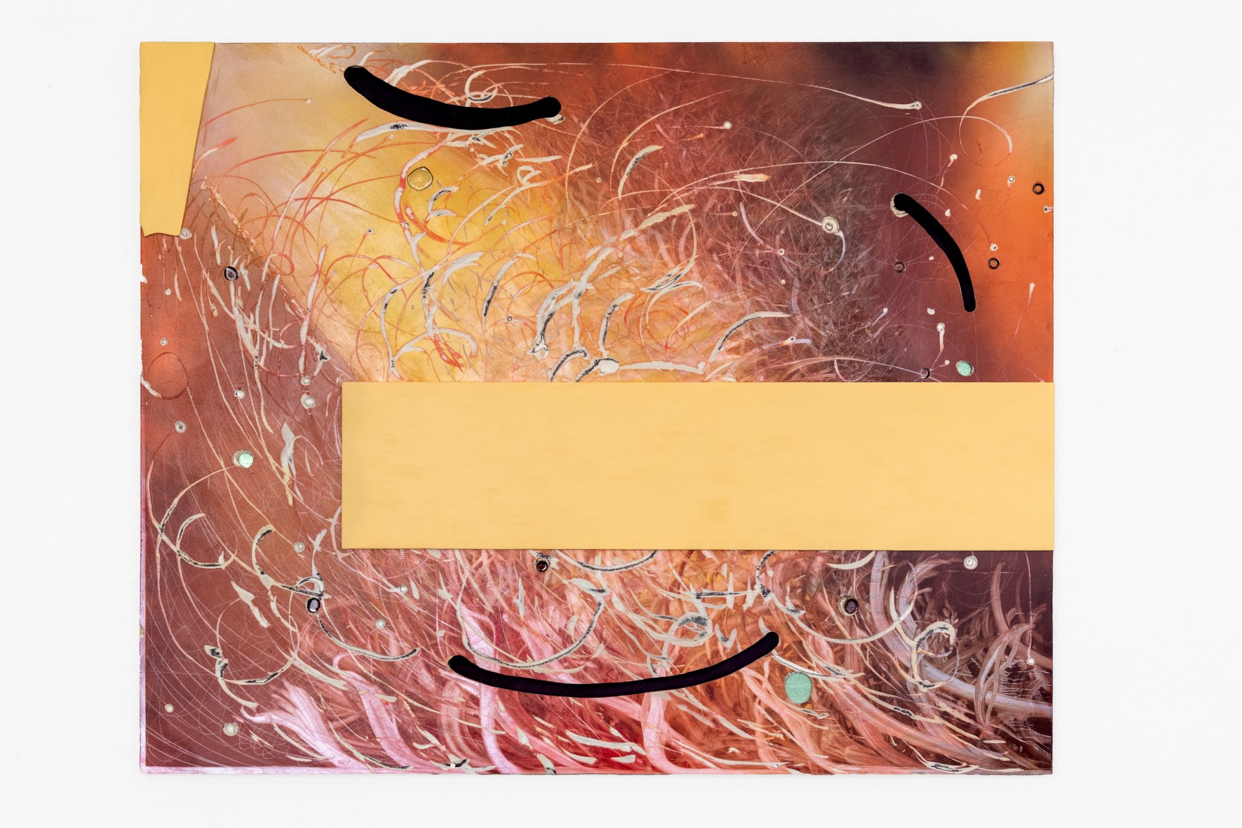 A geological dimension unfolds in stratified layers of wood, assembled and overlaid with oil, spray paint, or acrylic, then excavated through insistent, concentric gestures. Light rises from below, inscribed within a deep time, both consequence of action and enduring wound. Accidents and burns are integral to the painting. The raw clarity of wood is accessible only through the grey trails left by tools, through splinters and emergent screws. Nothing reveals itself without resistance.