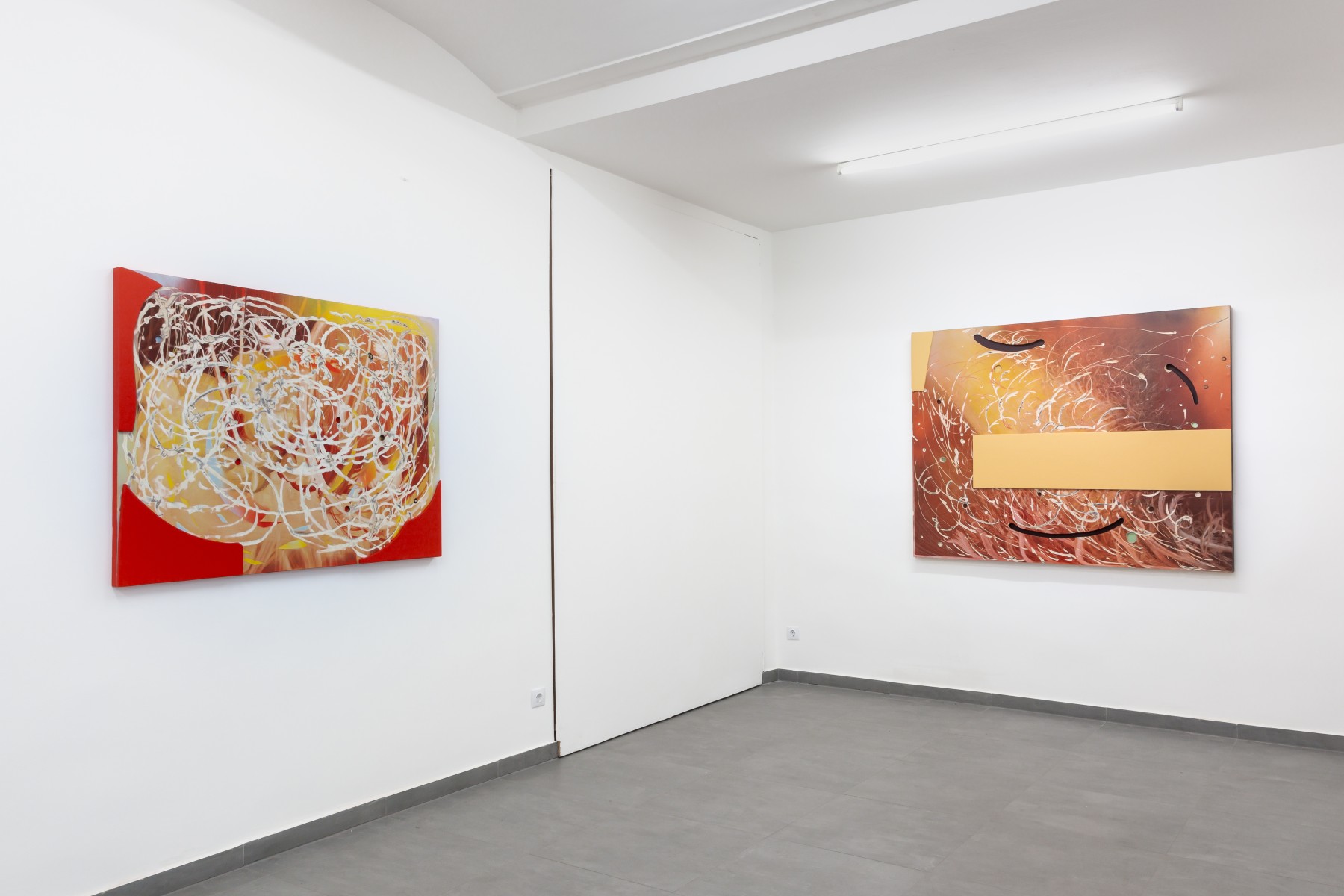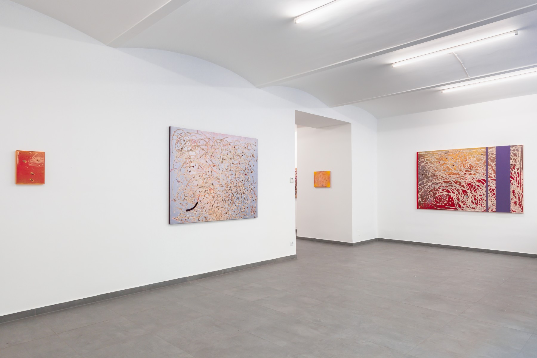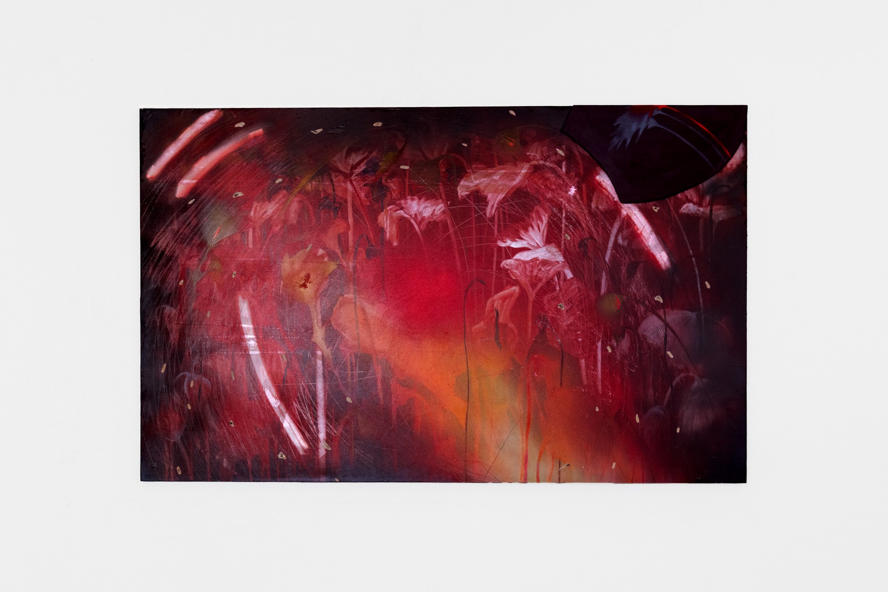 “The pink fabric gleamed like metal, reflecting the sun’s rays until they pierced the retina.” Thus was Tanaka Atsuko’s Pink Rayon described, nylon unfurled in open air in 1956 at Ashiya Park near Kobe. Noon light, solar red, brilliance carried to the point of perforation. The contained and irradiated energy of the Gutai group, this “meteorology” of impact, accompanied Rose Ras throughout the making of this exhibition. It resonates in her gestures and in her palette: heated, incandescent cadmium reds and cinnabar, ochres, burnt siennas. Yet within the burn, color settles into fields of pallor, Naples yellow, auroral orange, ash-blue. There is no pure black, no unblemished white, only broken hues, altered, fused into matter.