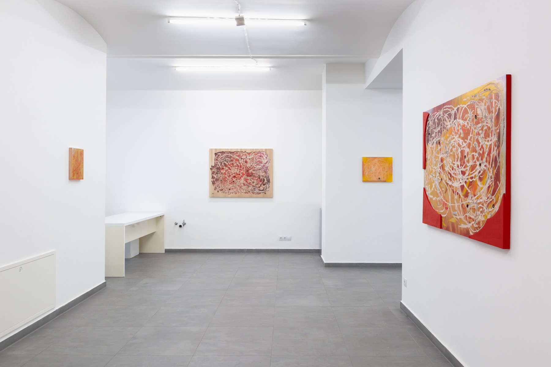 Clarity shifts. Zones of mist suspend reading; what seems distant sometimes appears more precise than what surfaces. Another temporality emerges, atmospheric, then physical, requiring the gaze to move from painting to painting in order to grasp what unfolds: a form or counter-form, a resin-filled hollow, an inverted horizon that obstructs and then draws the eye inward again. Ras sustains a delicate equilibrium of excess and withdrawal. The emotional intensity and forces she summons are not dissipated in wood dust; they demand to be endured, yielding only to those willing to expose themselves to them.