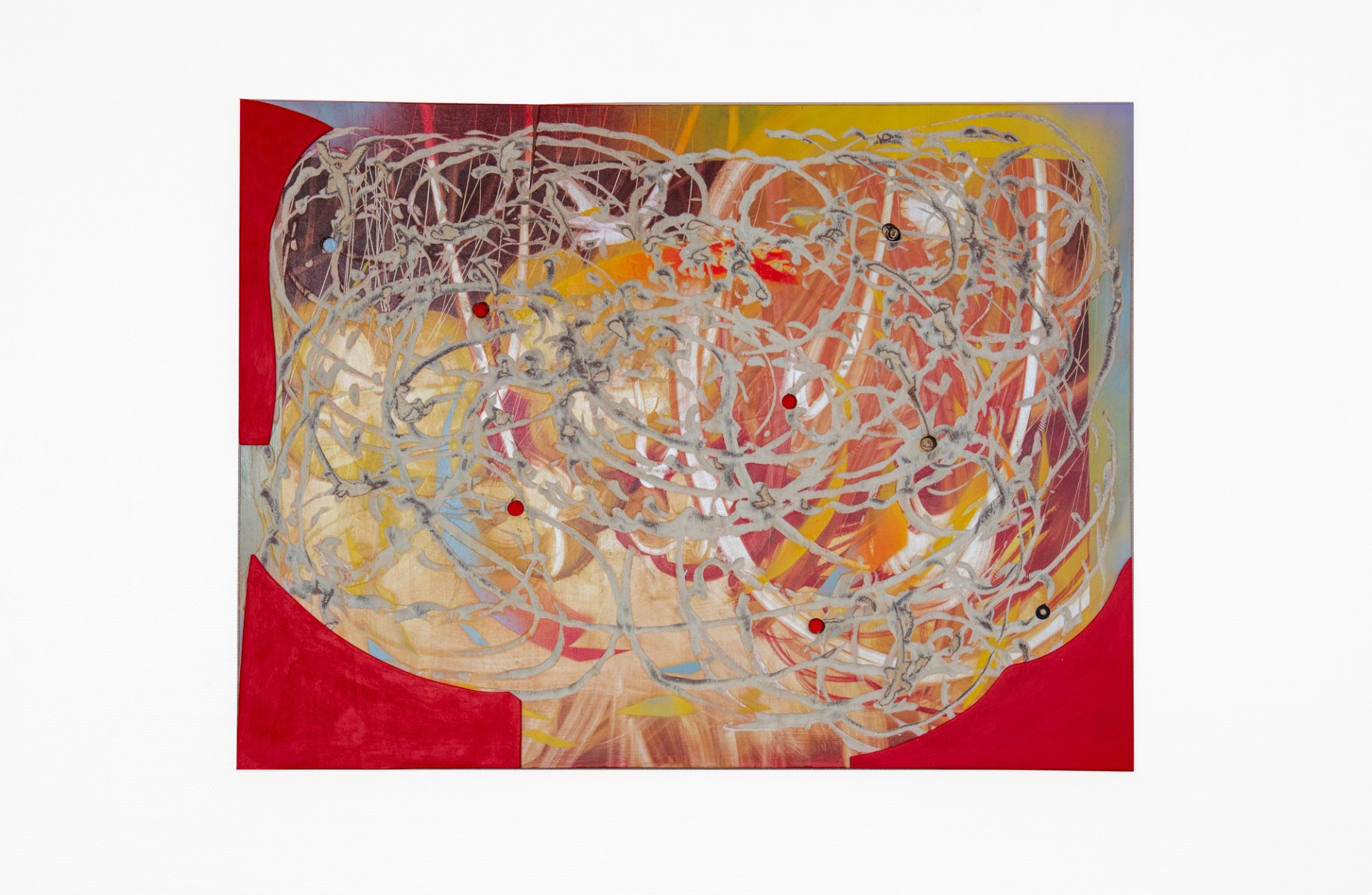 She digs through an initial image to reveal an unreal geography of reliefs. Her paintings thus operate within a constant tension between control andinstability.